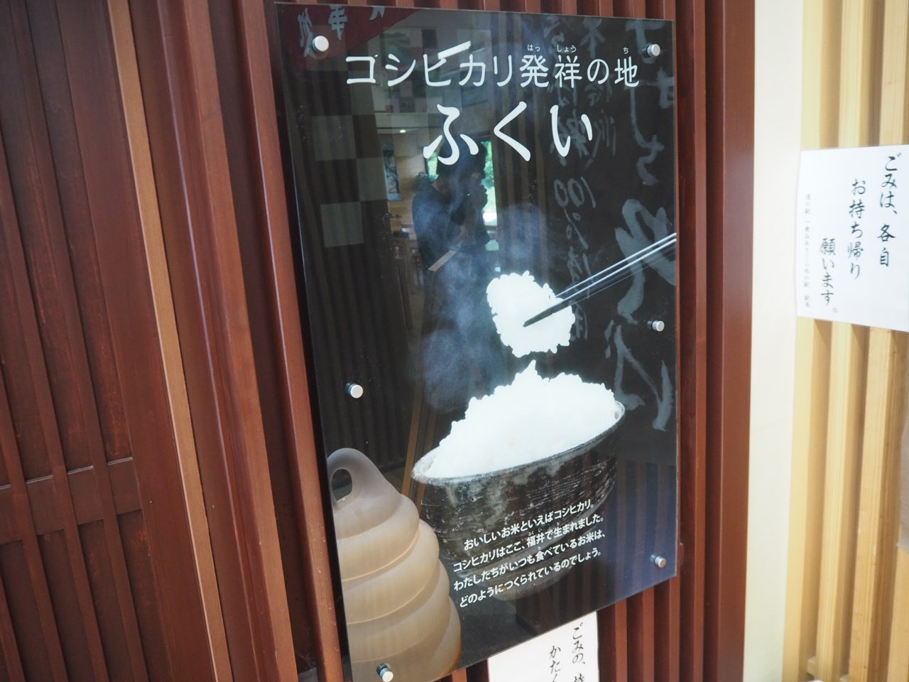 道の駅看板 駐車場 三連水車 ビオトープの生き物や体験農園のために使われているそうです ふれあい情報館入口 駅の表札?!的な看板あり 海老天おろしそば お蕎麦が美味しかった 越前おろしそば 妻も満足されていました コシヒカリ発祥の地 コシヒカリは福井で生まれたそうです、美味しいお米をありがとう☆
