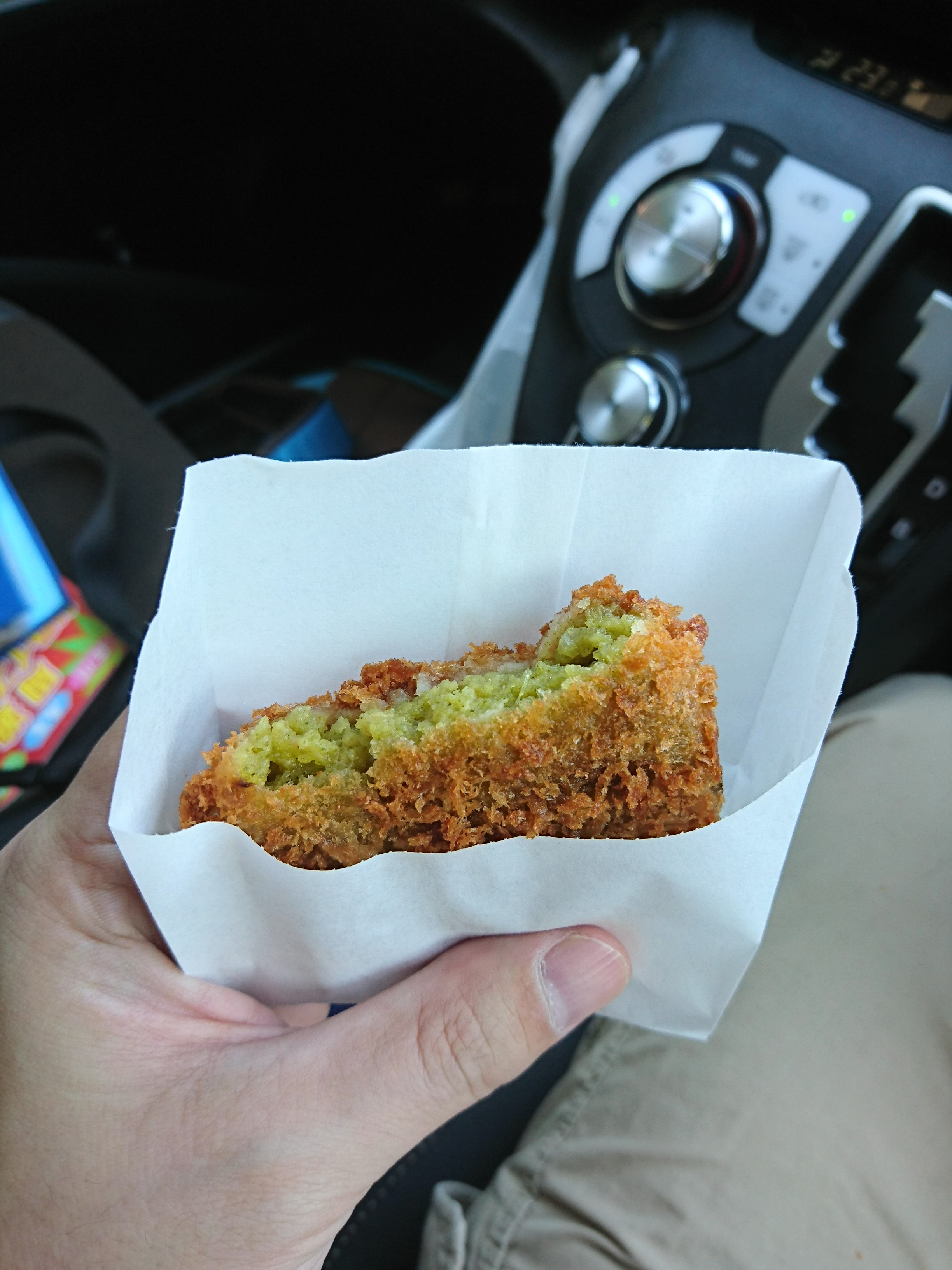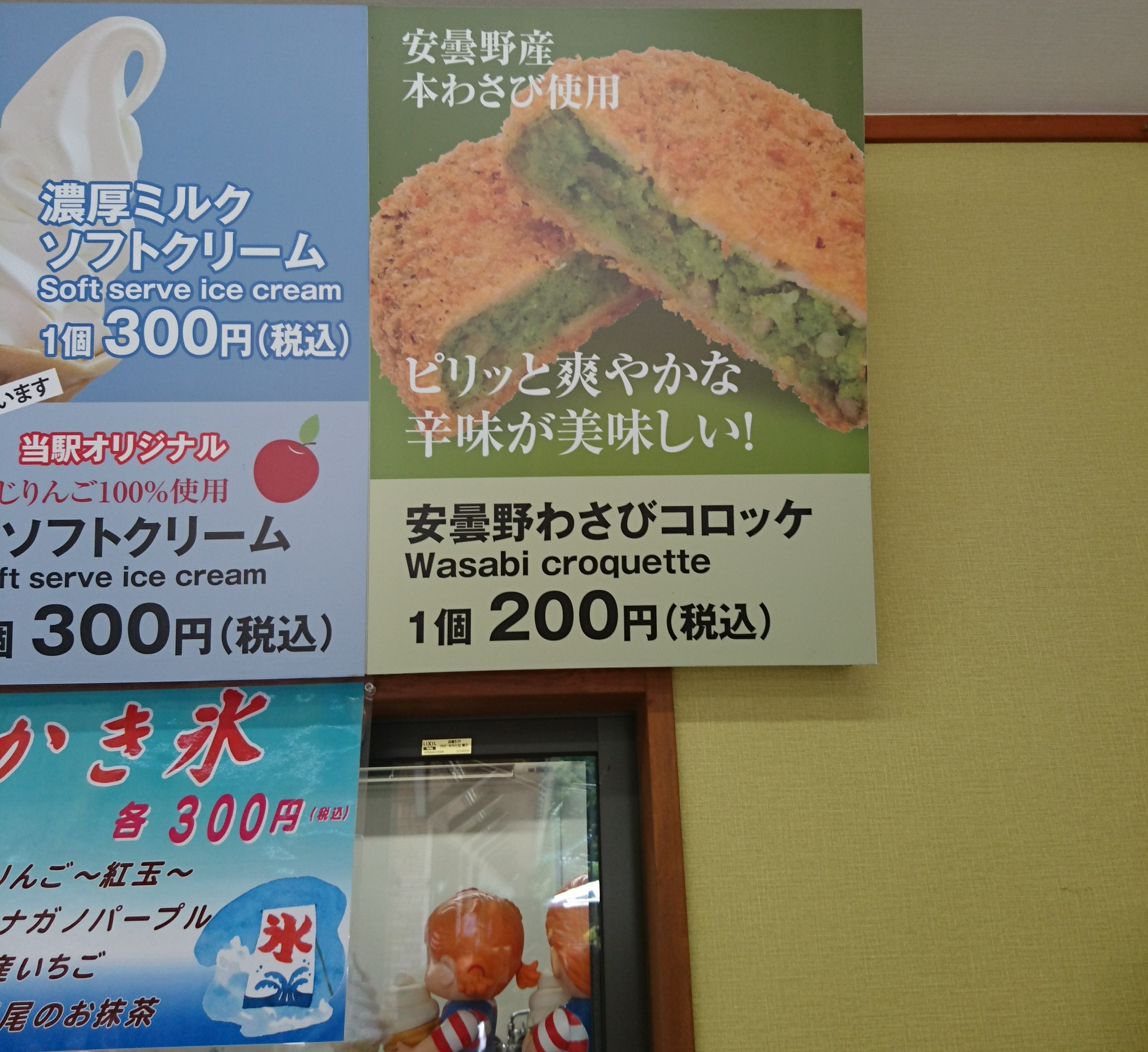 店舗玄関 木の香りが漂う素敵な佇まいです。 駐車場 安曇野わさびコロッケ 1個200円、中身全部緑(笑) 実食!!! 見た目ほど辛くはなかったです(^^)/個人的にはクリーミーで美味しかったです。好みは分かれそうですが(笑)